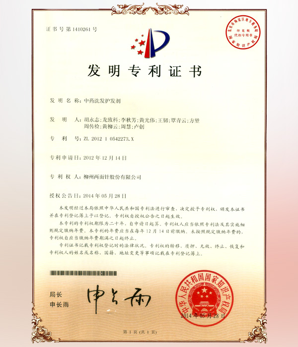 中藥洗發(fā)護發(fā)劑-專利證書